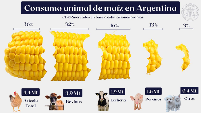 Se estima que el uso forrajero de maíz 2024/25 totaliza 12,3 Mt. Alrededor de un tercio de este consumo correspondería al sector avícola, tanto carne como huevos, otro tercio al sector de producción de carne bovina, un 19% consumiría la lechería, un 13% el sector porcino y un 3% para otros consumos, principalmente petfood.