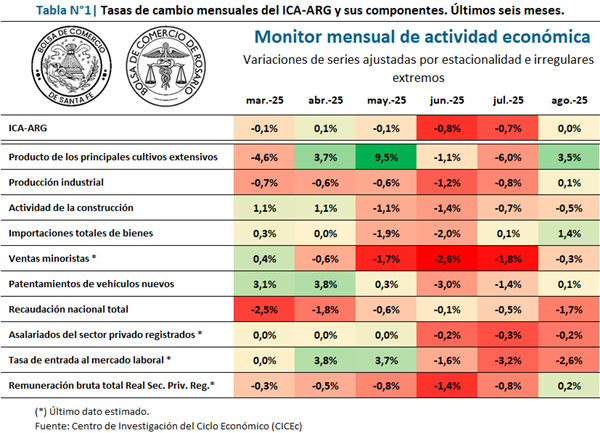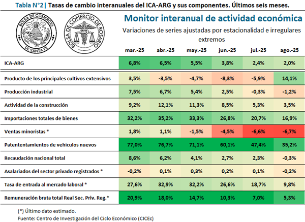 Si bien se pausa el retroceso de los meses anteriores, el ICA-ARG tuvo resultados adversos en cuatro de los ocho primeros meses del año, lo que deja el nivel de agosto un 0,2% por debajo al de diciembre de 2024. No obstante, la tasa de cambio interanual permanece positiva, con una variación del 2,0%.