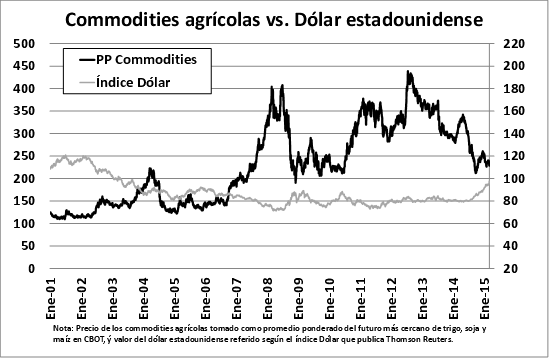 La apreciación del dólar, además, tiene una correlación negativa con el precio de los commodities agrícolas que, en el mercado internacional, se valúan en divisa norteamericana. Por ello al encarecerse la moneda de EEUU los granos en general sufren una revalorización que los hace más onerosos para el comprador internacional.