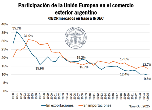 En los primeros diez meses al año la Argentina destinó el 9,8% de sus exportaciones a los 27 países que hoy conforman la Unión Europea (UE). Esta participación representa el menor peso de la UE en exportaciones argentinas en al menos 35 años. Asimismo, de enero a octubre de este año el 13,7% de las importaciones traídas al país se originaron en países del bloque europeo. Esto representó la segunda participación más baja en tres décadas y media, sólo con el 2022 marcando una peor participación que lo que va del 2025.