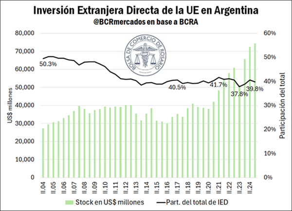 Además del plano comercial, no debemos olvidar que los capitales provenientes de la UE en conjunto representan cerca del 40% de la Inversión Extranjera Directa (IED) del país, lo que lo convierte el bloque en el principal inversor extranjero en Argentina. Al 31 de marzo de 2025 la UE acumula el 39,8% del total de IED invertido en la República Argentina, con España, Francia y Alemania como protagonistas. La consolidación del acuerdo traería consigo grandes oportunidades de inversión en el país.