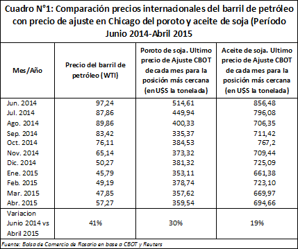 El poroto de soja en Chicago corrió la misma suerte que el barril de petróleo. El 30/6/2014 la posición Julio 2014 en el mercado de futuros de Chicago ajustaba a 514,61 U$S la tonelada. Para Abril de 2015, en el último día, la cotización había bajado a 359,54 U$S la tonelada. La caída puntual entre el final de junio de 2014 y el último día del mes de abril de este año ascendió al 30%. Y el aceite de soja cotizaba en Chicago a 856,48 U$S la tonelada el 30/6/2014. Para abril del 2015, en apenas 10 meses, su cotización era de 694,66 U$S. Una caída del 19%.