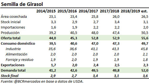 El aumento esperado en el procesamiento de girasol en Argentina sería el resultado de una mayor producción de la oleaginosa en el territorio nacional. Los atractivos precios internacionales del aceite de girasol en época de siembra sirvieron como principal incentivo para la decisión de aumentar las hectáreas implantadas. Así, la producción de grano pasaría de 3,5 Mt en la campaña 2017/18 a 3,8 Mt en la 2018/19, que combinada con mayores inventarios al inicio darían lugar a un crecimiento del 15% en la oferta total estimada.
