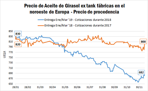 A esta fuerte baja de precios en el 2018 hay que sumar la presión estacional de cosecha del hemisferio norte, la cual pareciera impedir cualquier posibilidad de recuperación considerable de los precios del aceite de girasol en el corto plazo. Sin embargo, debe tenerse en cuenta que algún cambio en el precio de otros aceites vegetales como el de palma podrían afectar también el precio del aceite ya que ambos se encuentran correlacionados.