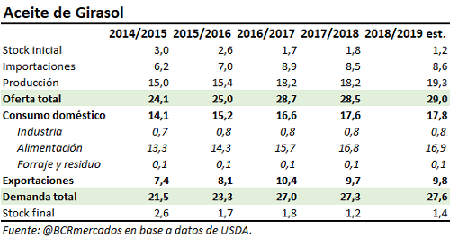 El stock final de semillas de girasol para la 2018/2019 se estima mayor al de la campaña anterior, totalizando, de acuerdo al USDA, 3,6 Mt. El crecimiento del 17% en las existencias mundiales se explica sólo en parte por el crecimiento de la producción y es esencial destacar el impacto que tuvieron sobre ellas las exportaciones, lastimadas por las menores compras por parte de Turquía y EEUU.