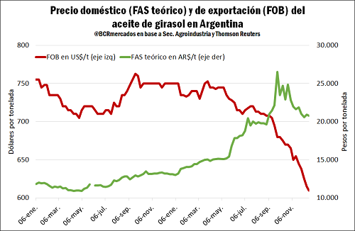 En el gráfico adjunto, se observa la cotización FOB de aceite de girasol argentino en U$S/t sobre el eje izquierdo, y asimismo el FAS Teórico del aceite, según lo estima la Secretaría de Agroindustria de la Nación, en AR$/t sobre el eje derecho.