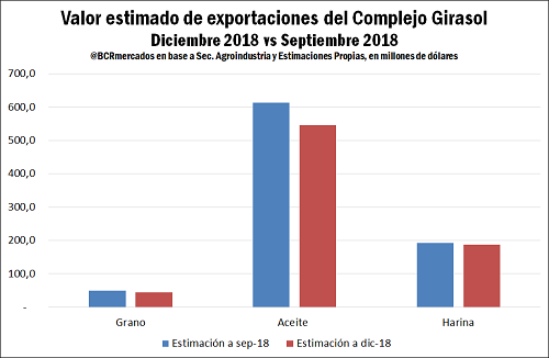 Según las estimaciones de exportación argentina de grano, harina y aceite por 0,15, 0,88 y 0,93 Mt, respectivamente, con los precios vigentes en septiembre de 2018 -cuando empezaron las labores de siembra de la nueva campaña en el campo argentino-, Argentina esperaba exportar bienes del complejo girasolero por un valor en torno a los US$ 856 millones. Con las bajas cotizaciones vigentes en diciembre, este monto cae a US$ 777 millones, lo cual implica que Argentina resigna un ingreso de divisas cercano a los US$ 80 millones, mayormente atribuibles a la caída en el precio internacional del aceite.