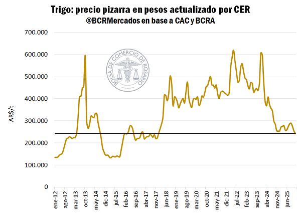 Con la ingente llegada del trigo nuevo al mercado, los precios disponibles se resintieron fuertemente. El cereal paso de promediar US$ 182/t durante los primeros veinte días de noviembre, a tocar piso en US$ 161/t y estabilizarse entre los US$ 165 y US$ 171/t en la semana. Comparando con el histórico y actualizando las cotizaciones en pesos según el efecto de la inflación, hoy el precio pizarra por trigo en Rosario es el más bajo desde diciembre del 2017.
