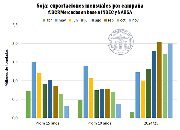 Durante noviembre se embarcaron 2 Mt de poroto de soja, récord para el mes y un 41% por encima del máximo anterior del 2019. En lo que va de la campaña, las exportaciones de soja llegan a 11,3 Mt, máximos en una década y el tercer valor más alto de la historia para esta altura del año. Este ciclo está rompiendo completamente con la estacionalidad habitual de los embarques de soja, siendo el efecto de la guerra comercial el principal culpable de ello.