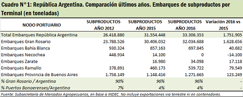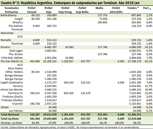 En el cuadro N°2 se brinda información desagregada de los embarques por terminales portuarias y área geográfica relevante. En el año 2016 y en línea con la tendencia de los años previos, las terminales portuarias del Gran Rosario mantuvieron su importante participación en el total de los despachos de exportación de subproductos argentinos. La cifra es impactante: el 96,2% de los despachos de Argentina salieron por los puertos de la zona de influencia de Rosario. En el 2015 la participación había sido del 96,4%. De esta forma, se mantiene firme la relevancia de los puertos de la zona rosarina como actores centrales del comercio exterior argentino de subproductos. Recordemos que durante los últimos 4 años el sistema portuario 'Up River Paraná' o 'Gran Rosario' incrementó su participación del 90% en el 2012 al 96,2% en el 2016.
