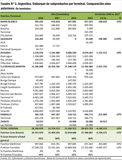 En el año 2017 los despachos de subproductos al exterior, desde todas las terminales portuarias argentinas, totalizaron 28,2 millones de toneladas (Mt), disminuyendo en 4,5 Mt el volumen registrado en el 2017.