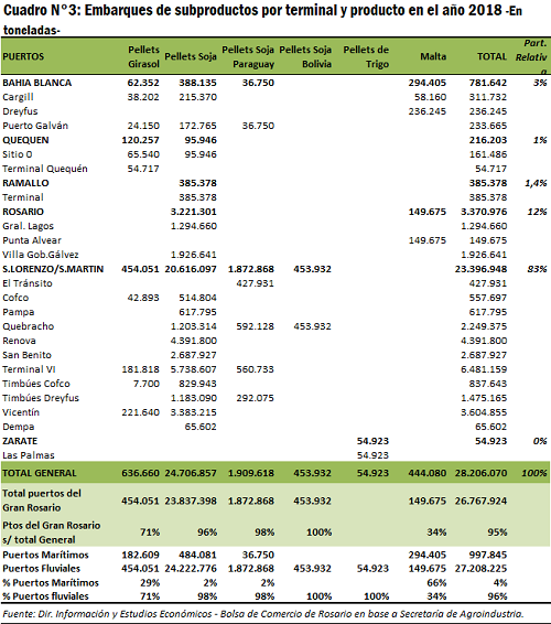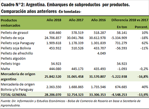 En 2018 se embarcaron 28,2 millones de toneladas de subproductos de origen argentino, aproximadamente 4,5 Mt menos que el año anterior. El 96% de estos embarques fueron pellets de soja, mientras que el resto se repartió entre malta, pellets de trigo y pellets de girasol.