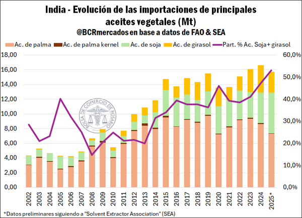 A comienzos de los 2000, las importaciones de la India rondaban entre 4 y 5,5 Mt y estaban muy enfocadas en el aceite de palma. Mientras que, desde 2008 en adelante se comienza a vislumbrar un crecimiento muy importante de la demanda hasta llegar a ubicarse entre 13,7 y 16,6 Mt en la última década. A nivel global, en 2024 se alcanza el récord de importaciones con 16,6 Mt y en 2025 habrían caído, según SEA, hasta 15,7 Mt si se observan los principales aceites.