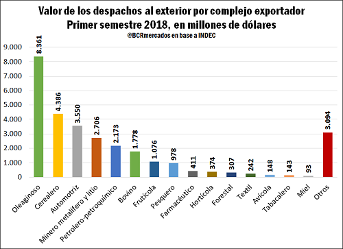 En el caso de la soja específicamente, a pesar que la producción cayó más de 20 millones de toneladas respecto al año anterior, aún es el núcleo del principal complejo exportador de la economía argentina. En los primeros seis meses de 2018 sus embarques totalizaron US$ 7.558 millones, lo que equivale al 25,3% del total. El volumen exportado por el complejo, no obstante, resulta un 15,5% menor a las exportaciones registradas durante igual período en 2017.