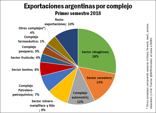 Según datos oficiales del INDEC, en el primer semestre de 2018 las exportaciones argentinas ascendieron a 29.822 millones de dólares, un 5,5% por encima del volumen registrado a igual fecha el año pasado. Clasificando los despachos por complejo exportador, el ranking fue liderado por los sectores oleaginosos y cerealeros, quienes en conjunto originaron ventas al exterior por 12.687 millones de dólares, incluso en el marco de una feroz sequía que diezmó la producción. De esta forma, en el primer semestre del año, los complejos oleaginosos y cerealeros representaron el 43% de las exportaciones argentinas, una cifra elevadísima.