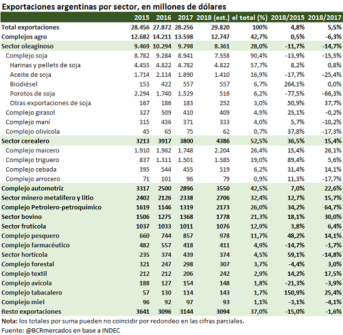 Como indicamos antes, en conjunto los sectores oleaginosos y cerealeros originaron entre enero y junio de 2018 el 43% de las exportaciones argentinas. Les siguen, en orden de importancia, el sector automotriz con el 12% de los despachos, minería con un 9%, petrolero-petroquímico con un 7%. En tanto, las operaciones originadas por el sector bovino representan un 6% del total, un 4% el frutícola y un 3% el pesquero.