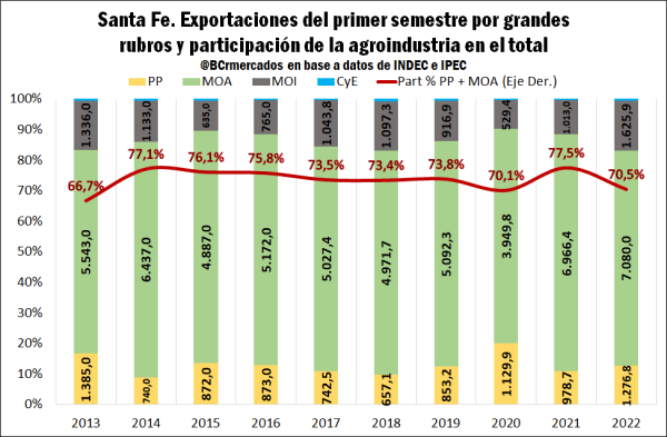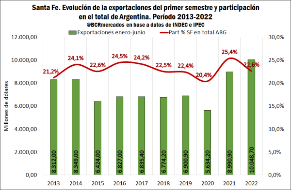 En el primer semestre de 2022, la provincia de Santa Fe exportó productos con origen provincial por US$ 10.048,7 millones, es decir, US$ 1.057,8 millones más que igual período de 2021. Asimismo, si se compara con los años previos, es el máximo valor alcanzado desde, al menos, 2013.