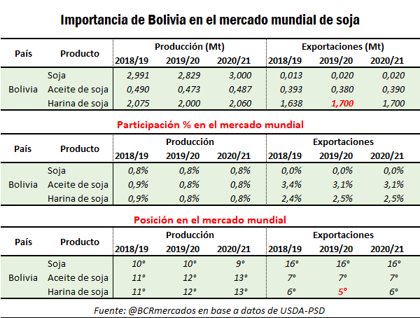 Por último, en el siguiente cuadro se pueden observar datos de la importancia del complejo soja boliviano en el mercado mundial. En cuanto a la producción de soja y subproductos, tiene una baja participación respecto al total aunque se encuentra entre los 10 principales productores de soja a nivel mundial, lo cual indica una concentración importante del cultivo en pocos países.