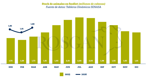 Según datos del SENASA, al 1° de marzo los feedlots reportaban 1,88 millones de cabezas, un 9% más que en 2025, cuando se había registrado otro récord histórico de 1,73 millones de cabezas para la misma fecha.