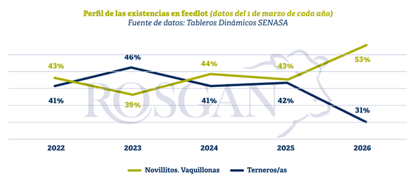 En contraste, los novillitos y vaquillonas, que un año atrás constituían el 43% del stock, aumentaron su participación hasta representar el 53% del total de hacienda en corrales.