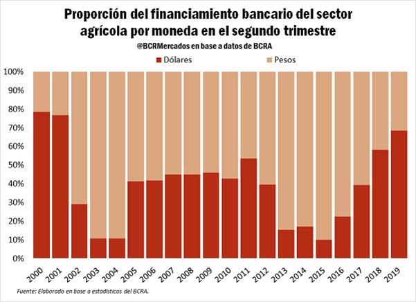 Debido al esquema de agregados monetarios que aplicó el BCRA para controlar la inflación, la tasa de interés endógena en pesos resultante de este compromiso aumentó muy por encima de las expectativas inflacionarias. El incremento resultante de la misma generó que muchos productores se inclinen a la toma de préstamos en dólares. En la ecuación financiera, con insumos dolarizados, ingresos correlacionados con el tipo de cambio y tasas de interés menores, se torna conveniente la toma de préstamos denominados en moneda extranjera, ganándole a la estrategia de financiación en pesos. El promedio de las tasas de interés pagadas por el financiamiento en dólares fue del 6 a 7 % anual en el segundo trimestre del año 2019 mientras que las tasas en pesos alcanzaron valores superiores el 70 % anual. Recordemos que dos años atrás, las tasas de interés en dólares de los préstamos bancarios a productores oscilaban entre el 4/4,5% anual.