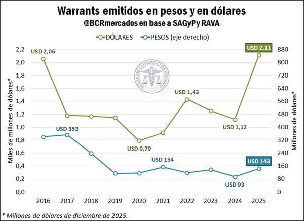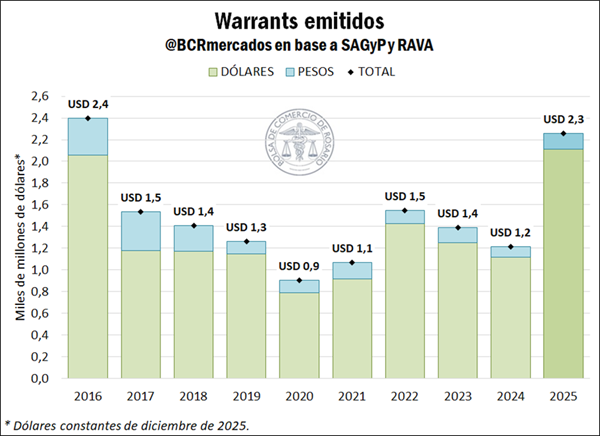 Estas modificaciones mostraron importantes resultados: en 2025 la emisión de warrants en dólares y en pesos ascendió a una suma de U$S 2.257 millones, marcando un incremento interanual del 86% y siendo el mayor registro desde 2016. Cabe aclarar que este valor se obtuvo de convertir a dólares las emisiones mensuales en pesos utilizando el tipo de cambio financiero del Mercado Electrónico de Pagos (MEP) promedio mensual, y de expresar todos los guarismos en dólares constantes de diciembre de 2025 para reflejar los valores en términos reales.