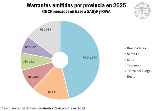 En segundo lugar, aunque muy por detrás de Buenos Aires, emerge la provincia de Santa Fe, con el 15,5% de los warrants emitidos en 2025. En términos de valor, el total emitido en el año por nuestra provincia ascendió a U$S 351 millones, por lo que triplicó lo registrado un año atrás (+211%) y fue la mayor cifra desde 2016. Le siguen, en orden decreciente de importancia, Salta (9%), Tucumán (7,2%) y Tierra del Fuego (7,1%).