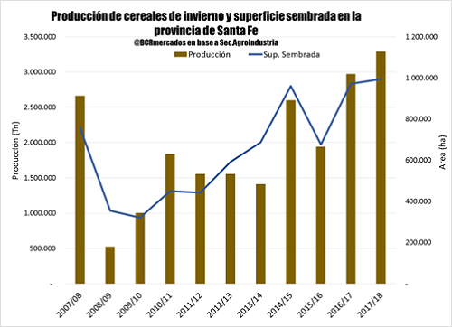 En relación a la producción, la provincia de Santa Fe tiene una larga tradición en cereales de invierno. Sin embargo, las condiciones comerciales como los avatares climáticos han provocado fuerte vaivenes de la superficie sembrada y la producción. Esto puede observarse en el siguiente gráfico que muestra como la producción ha caído significativamente en la campaña 2008/09 debido a la imposición de ROES y derechos de exportación, mientras que en las campañas 2016/17 y 2017/18 han mostrado una importante recuperación en volumen y producción cuando dichas medidas comerciales se modificaron.