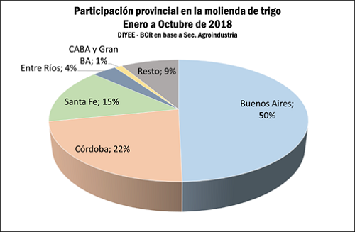 En lo que va del año 2018, con datos hasta octubre, la provincia de Santa Fe ha sido responsable del 15% del procesamiento nacional de trigo, con casi 700.000 toneladas. La participación de la provincia en la actividad ha ido en crecimiento durante las últimas dos décadas, partiendo desde un 11% en 1998.