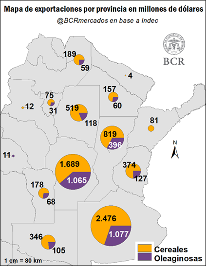 Por el lado de las exportaciones de grano, se prevé que Argentina embarque en la campaña 2018/2019 el 66% de su producción. Trasladando este coeficiente a la cosecha santafesina, eso significa que alrededor de 1,95 millones de toneladas de la producción provincial tendrían como destino el mercado externo. A un valor FOB de referencia hoy de US$ 223/t, puede inferirse que las exportaciones del grano con origen en Santa Fe generarán un ingreso de divisas total de US$ 435 millones.