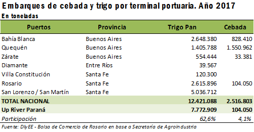 En tanto, más de la mitad de los embarques totales de cebada y trigo se despacharon desde los puertos santafesinos en el año 2017. Si bien tradicionalmente la cebada se produce y exporta en el sur de Buenos Aires, es destacable el aumento de la participación de los puertos del Gran Rosario en los embarques de trigo. Hace apenas 10 años atrás, en el 2007, esta participación caía al 51% mientras que en 1997 apenas alcanzaba el 35%.