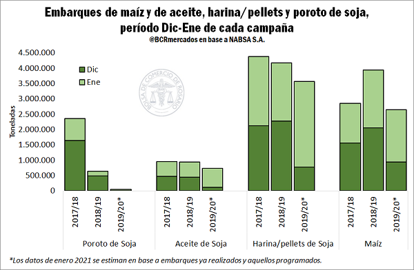 Sin embargo, se puede apreciar que en enero se está trabajando para compensar ese retraso logístico generado por el paro. Sumando a lo ya despachado a la fecha, lo programado para embarcar en lo que resta del mes, los envíos al exterior de aceite de soja totalizarían 620.000 t, un 28% más que en 2020, mientras que el volumen de harina y pellets a embarcar se ubicaría en 2,8 Mt (+48% vs. ene 2020). Para el maíz en grano, el total a estimado para embarques durante el presente mes de enero es de 1,7 Mt, lo cual representa un volumen menor que en enero pasado. Sin embargo, esto tiene que ver con que, a diciembre inclusive, ya se había exportado casi la totalidad del proyectado a embarcar durante la corriente campaña (33,5 Mt sobre un total de 36 Mt).