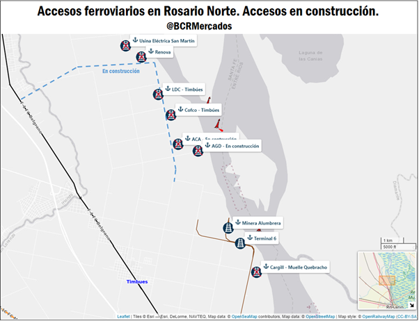 Cómo mencionábamos en el citado informe del 2 de agosto de 2019, una serie de obras se están desarrollando en la actualidad en la zona de Timbúes para incorporar nuevas plantas al tendido ferroviario nacional. Con esta nueva infraestructura se conectarán nuevas terminales portuarias a la red del Belgrano Cargas, habilitando cinco nuevas terminales en la zona, con capacidad para recibir mercadería por ferrocarril. Las plantas que pasarán a tener estas facilidades son las de Renova, controlada por Glencore y Vicentín, la planta de Louis Dreyfus en Timbúes, la planta de COFCO en Timbúes; y las plantas de la Asociación de Cooperativas Argentinas y Aceitera General Deheza, ambas en construcción en este momento, también en la localidad de Timbúes.