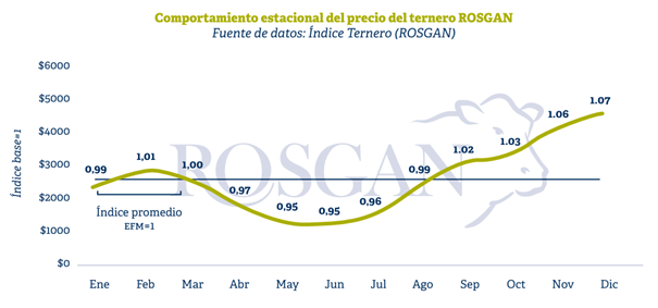 Sin dudas, detrás de las subas registradas durante septiembre y octubre existe un componente estacional que explica gran parte de esta tendencia alcista en los precios. La propia dinámica de salida de los terneros de los campos genera momentos de mayor concentración de oferta —con efecto bajista sobre los precios— y otros en los que la oferta comienza a escasear, lo que tiende a impulsar los valores al alza. Tal es el caso de los meses de septiembre, octubre, noviembre y diciembre, cuando los precios de la invernada suelen ubicarse entre 2 y hasta 7 puntos porcentuales por encima del promedio general anual.
