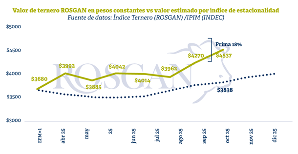 El índice de referencia para el Ternero ROSGAN alcanzó los $4.537 por kilo, lo que representa un incremento del 8,1 % frente a los valores observados en septiembre y del 47,9 % en lo que va del año. Asimismo, al analizar la serie histórica desde enero de 2010, medida en pesos constantes ajustados por inflación (IPIM), el valor actual del ternero se ubica un 40% por encima del promedio de los últimos 15 años, siendo el tercer valor más alto, solo por detrás de los máximos registrados en diciembre de 2015 y diciembre de 2021, dos períodos marcados por una fuerte inestabilidad política y cambiaria.