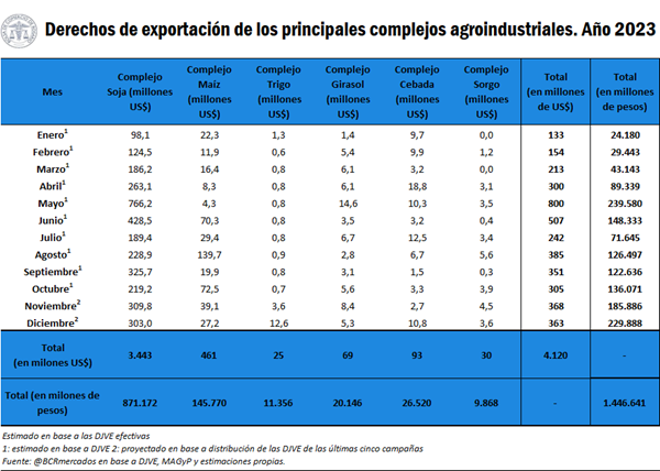 Para el año entrante será de vital importancia lo que termine aconteciendo con las producciones de soja y de maíz, principalmente, ya que, como se mencionó, el trigo 2023/24 no contará con mucho margen para el anote de nuevas ventas externas. Lo que pueda acontecer en los próximos meses con la producción agrícola no sólo resulta vital en cuanto a su posible aporte en términos de Derechos de Exportación, sino que también lo será para toda la economía argentina, siendo el sector agroexportador un gran generador de empleo, divisas y otros recursos tributarios.