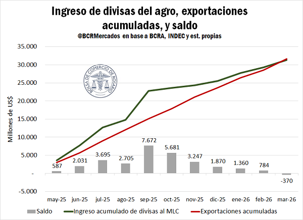Este ajuste al alza en las estimaciones de las exportaciones de maíz a 43 Mt desde los 41 Mt previstos hace un mes; sumado a un programa de embarques más acelerado de semillas de girasol y precios levemente mayores a los vigentes hace un mes producto del conflicto bélico en Medio Oriente dejan a la actualización en la estimación de liquidación de divisas del agro en US$ 35.375 millones para 2026, lo que significa un incremento de casi US$ 1.000 millones respecto de marzo.