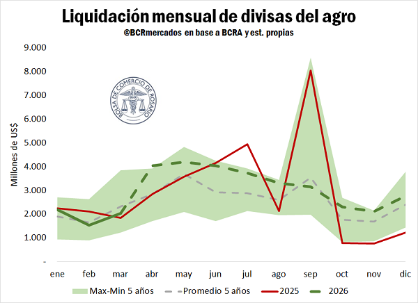 Por este motivo, tal como se aprecia en el siguiente gráfico, se estima que el flujo de divisas del agro se incremente notoriamente a partir de abril, manteniéndose por encima del promedio del último lustro para todos los meses que restan del 2026. Entre abril y diciembre se estima que la liquidación de divisas acumule US$ 29.600 millones: US$ 16.500 millones de soja y derivados, US$ 7.500 millones de maíz, US$ 2.200 millones del complejo trigo, US$ 2.400 millones del complejo girasol, US$ 500 millones del complejo cebada, US$ 300 millones de sorgo y US$ 600 en otros cereales y oleaginosas.