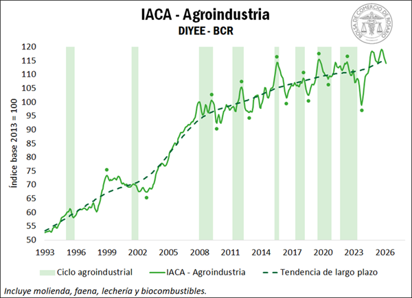 Por el contrario, el subíndice IACA-Agroindustrial arrojó una disminución del 0,7% respecto al año pasado, aunque se mantiene en niveles cercanos a máximos históricos. En este caso, la merma en sectores de gran peso tales como la faena de bovinos y la molienda de soja no logró ser compensada por el sólido incremento en otros rubros como la faena de porcinos y la molienda de girasol.