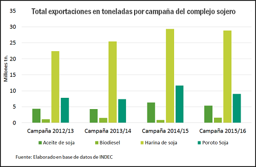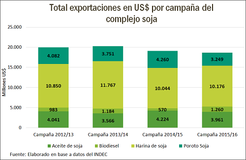 Si tomamos en cuenta la dinámica de las últimas campañas, el esfuerzo exportador del complejo sojero no alcanza a compensar la caída en los precios internacionales en los últimos años, en donde a pesar de haber aumentado los envíos del poroto y sus subproductos en la campaña 2014/15 y mantener un nivel levemente menor en la campaña 2015/16, los valores medidos en dólares no alcanzaron a sobrepasar el nivel de la campaña 2013/14.