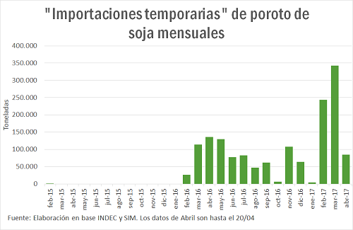 Observando el comportamiento de las 'importaciones temporarias' (mercadería que puede permanecer con una finalidad y por un plazo determinado dentro del territorio aduanero, quedando sometida a la obligación de reexportarla para consumo), se destacan los aumentos cada vez mayores en las importaciones de poroto de soja en los últimos meses (poroto de soja que se importa principalmente desde Paraguay también se registran importaciones de Bolivia, Brasil y Uruguay). Ello permite que las plantas puedan mantener un determinado nivel de abastecimiento y funcionamiento, mejorando la eficiencia productiva y llenando los baches de mercadería en los períodos de bajos stocks a nivel local. También por parte de la industria se han mencionado fundamentos de requerimiento de proteína en el poroto de soja para que la harina de soja pueda alcanzar el estándar del 46,5 de 'High Pro Meal' que caracterizan los envíos desde nuestro país, especialmente en una campaña donde las excesivas lluvias 'lavaron' parte del contenido proteico de las habas cosechadas en Argentina.