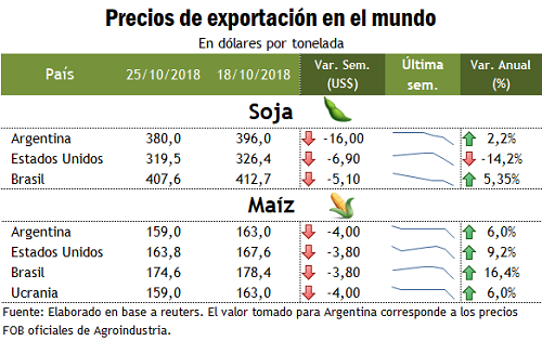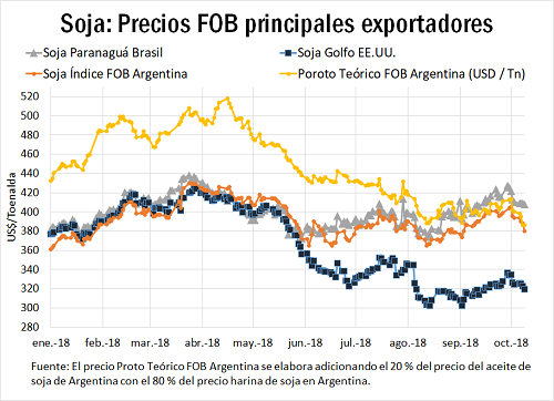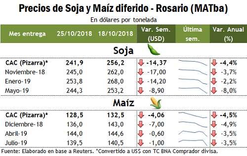 Los precios en moneda estadounidense por la soja en Rosario descendieron más US$ 11/t en una semana, siendo que el precio pizarra se fijó en 8.850 pesos el día jueves 25 de octubre. Una caída incluso mayor se trasladó a los contratos de futuros negociados por soja en MATba para los meses de noviembre y enero próximo. La disminución registrada en el contrato de Mayo 2019 fue aproximadamente la mitad, a pesar de que los precios en el mercado FOB a cosecha también hayan caído en la misma cuantía que en el embarque cercano.