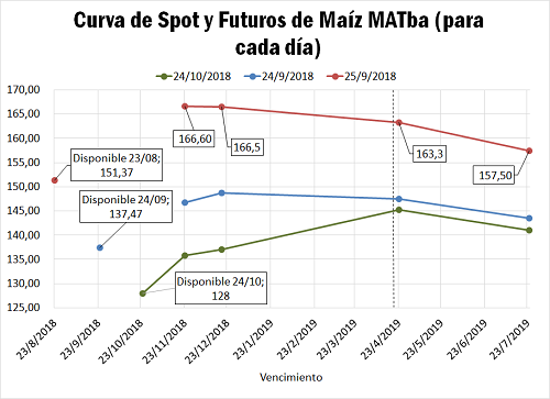 De esta manera, al descender en una menor cuantía el precio de los granos gruesos a cosecha, la curva de precios diferidos revirtió su pendiente, generándose un mercado que indica mayores precios a cosecha que en la entrega inmediata. Las tasas implícitas en los contratos a futuro de soja no alcanzan a cubrir el costo de fondeo en dólares más los costos de almacenaje, pero en el mercado de maíz la historia es diferente.