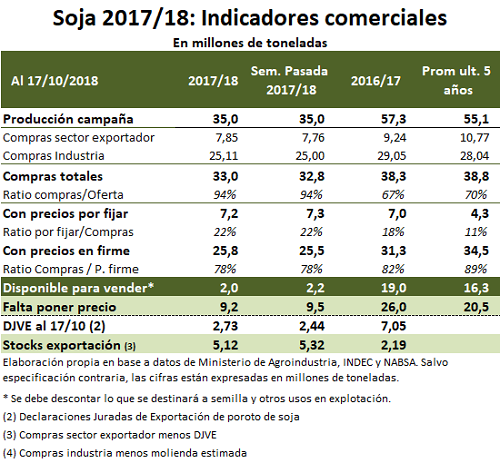 Todo lo comentado anteriormente se puede observar en las cifras relevadas por el Ministerio de Agroindustria. Al 17 de octubre, tanto la exportación como las plantas procesadoras llevan adquiridos el 94 % de la cosecha de soja 17/18. Este valor se encuentra muy por encima de años anteriores. La DJVE de poroto de soja se ha incrementado en la última semana en casi 300.000 toneladas. Los que quedan por vender son solamente 2 millones de toneladas, un valor casi nulo si lo compramos con otros valores de otras campañas a igual fecha.