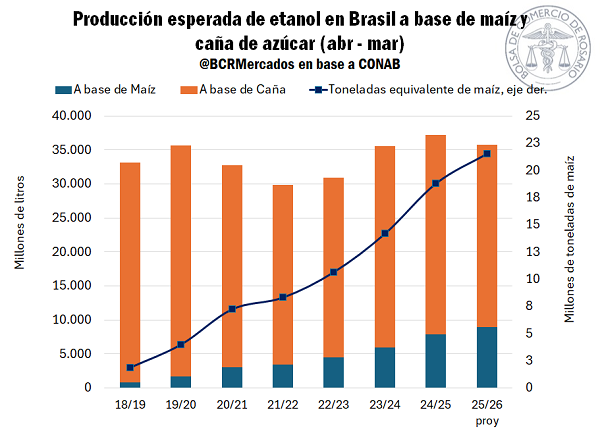 El maíz se convirtió en el segundo insumo principal para la producción de etanol, el primero es la caña de azúcar. Esta campaña, la producción de caña se vio afectada por el clima, cayendo ligeramente la cosecha de un ciclo al otro. Además, la configuración de precios internacionales y locales estaría llevando a que las industrias prioricen la producción de azúcar frente al etanol, disminuyendo la proporción de caña utilizada para el último en favor del primero. A la coyuntura productiva, hay que sumarle el hecho de que a partir de agosto de este año el corte obligatorio de bioetanol en Brasil pasó de B27 a B30, lo que implica un aumento directo de la demanda del biocombustible, traccionando indirectamente la demanda de caña y maíz (entre otros insumos). Bajo este escenario, CONAB proyecta para abril 2025–marzo 2026 una producción total de 35,7 mil millones de litros de etanol, con 9 mil millones elaborados a base de maíz. Esto implicaría el uso de unas 21,5 Mt del cereal, un 14% más interanual.