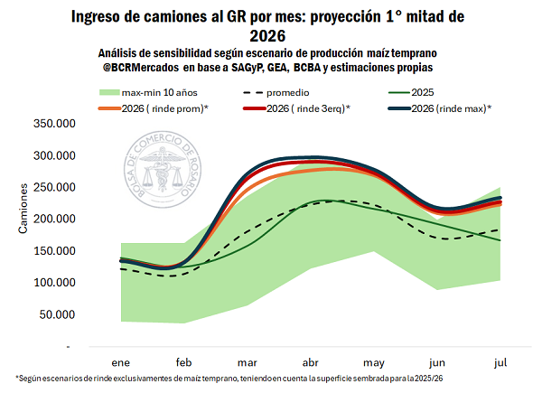 Partiendo de estos tres escenarios (rinde promedio, rinde al 75% de su mejor marca histórica y rinde máximo registrado a la fecha), y suponiendo que no hay una falla productiva generalizada, el potencial de flujo de maíz en el mercado interno sería inédito. Teniendo en cuenta que el despacho de maíz a puerto se registraría mayormente en torno al mes de marzo/abril, justo cuando comienza a cosecharse la soja, y en el marco de una producción récord de trigo, el ingreso de camiones a puertos del Gran Rosario podría ser un 80% mayor al promedio de los últimos 10 años, y entre un 25% y un 30% más alto que el máximo anterior. En otras palabras, se adelantaría la estacionalidad de descarga típica que se observa durante el mes de abril y marcaría máximos históricos para los meses de la cosecha gruesa.