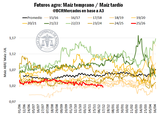 Teniendo en cuenta las proyecciones récord para la cosecha del temprano, la relación entre los contratos de abril y julio (de referencia para el maíz temprano y tardío) es la más baja en por lo menos de la última década. Es decir, en base a la oferta esperada de maíz el año que viene, el “premio” que se negocia en el mercado de futuros por maíz temprano sobre tardío es mínimo.