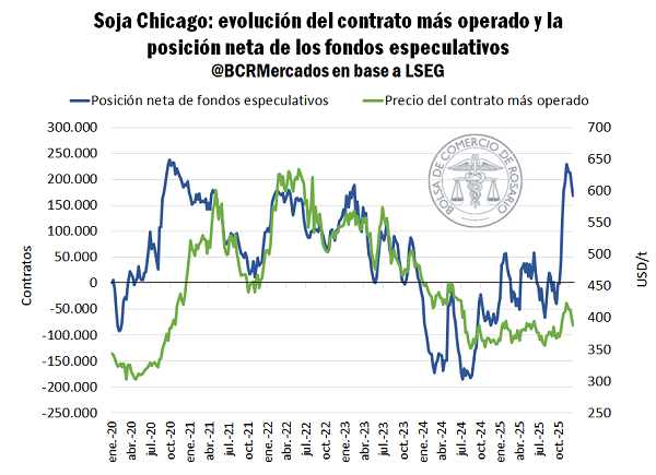 Más allá del desarme de posiciones largas de estas últimas semanas, los fondos mantienen una cartera comprada estimada en 168.000 contratos, máximos desde el 2023. Por lo tanto, aún resta mucho “poder de fuego” para continuar con el desarme lo que podría acentuar la tendencia bajista en Chicago, si es que las expectativas frente al flujo internacional de soja no cambian de rumbo.