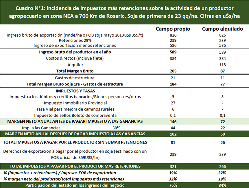 a) En un año normal, con un rinde de 23 qq/ha en campo propio, el productor –luego de pagar todos los impuestos- se queda con 100 U$S/ha, mientras que los Gobiernos se llevan 321 U$S/ha. El Estado –en todas sus jurisdicciones- obtiene el triple de lo que percibe el productor.