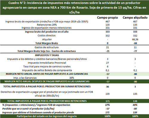 Bajo alquiler la situación con un rinde normal de 23 qq/ha presenta aún más desventajas para los hombres y mujeres de campo ubicados a 700 km de los puertos del Gran Rosario. Tienen que pagar altísimos impuestos y al mismo tiempo afrontar el alquiler (en este caso se calcula como 20% del ingreso bruto). Ni que hablar de los elevadísimos costos de flete camionero para llegar a Rosario. El productor soporta una enorme carga tributaria total (nacional, provincial y comunal) que puede verse claramente en el cuadro correspondiente.